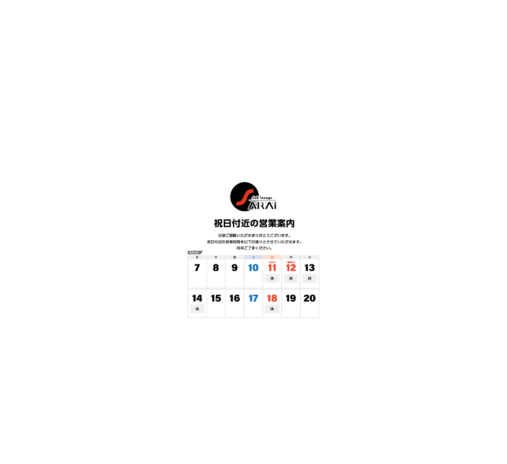 8月 祝日付近営業のお知らせ